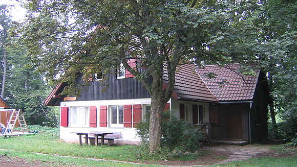 Gemütliches Selbstversorgerhaus für kleine Gruppen. So idyllisch wie sie da am Ende des großen Gartens beim Harpprechthaus liegt, so freundlich und offen in ihrer Ausstrahlung – so ehrlich stellt uns die Gedächtnishütte einen Stolperstein in den Weg.