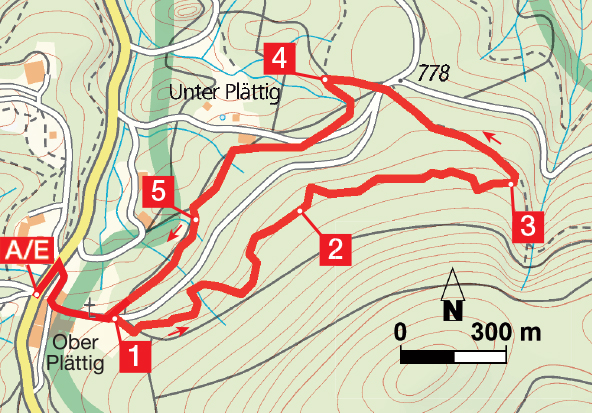 Wir gehen vom Wanderschild Plättig Parkplatz (771 m) zur Bushaltestelle, wo wir die Straße überqueren. Auf der anderen Seite halten wir uns kurz rechts zum Hotel, dann biegen wir links ab. An der links stehenden Antoniuskapelle (1) wandern wir rechts vorbei, kurz danach halten wir uns an der Verzweigung rechts, etwas später sehen wir links das Eingangsportal zum Wildnispfad.