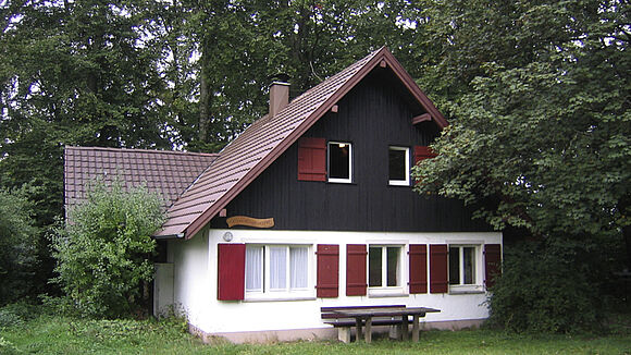 Gemütliches Selbstversorgerhaus für kleine Gruppen. So idyllisch wie sie da am Ende des großen Gartens beim Harpprechthaus liegt, so freundlich und offen in ihrer Ausstrahlung – so ehrlich stellt uns die Gedächtnishütte einen Stolperstein in den Weg.